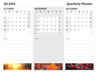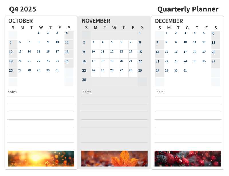 This Printable Q4 Quarterly Planner represents an organizational tool designed to help individuals plan their activities over the last three months of the year. It provides a clear visual layout of days and weeks, allowing easy scheduling and note-taking. The planner includes additional space under each month for important notes or reminders. The inclusion of seasonal images at the bottom adds an aesthetic touch, inspiring creativity and reflection on the transition through autumn.
