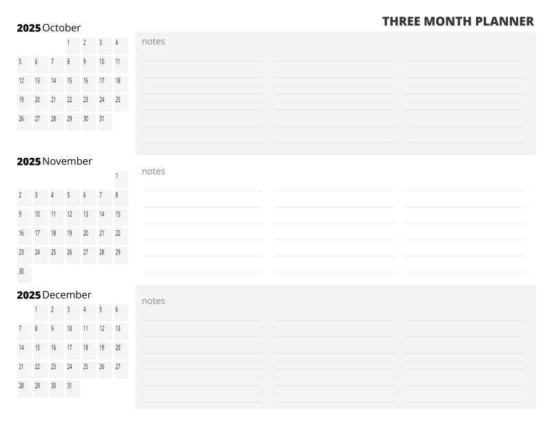 This planner could represent a tool for personal organization, helping individuals to plan their activities, appointments, and tasks over a three-month period. It can be especially useful for students, professionals, or anyone looking to manage their time efficiently. The structured layout encourages users to jot down important notes and reminders, making it a practical resource for enhancing productivity. Overall, this printable planner serves as a visual aid for effective time management and planning.