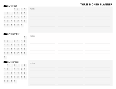 This editable calendar template is a three-month planner for the year. It currently features the months of October, November, and December, but it can easily be switched to any month combination using our editor. Each month is presented in a grid format with clearly marked dates, alongside designated spaces for notes, allowing users to organize their schedules effectively.