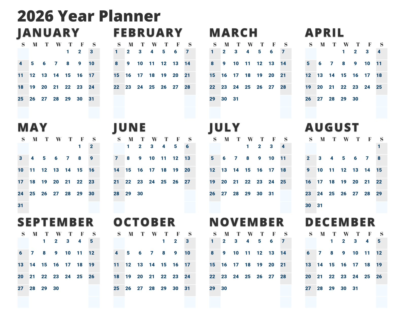 This printable year planner image comprehensively summarizes an entire year, meticulously organized into months. Each month is displayed in a grid format, with days of the week running from Sunday to Saturday. The month's name is prominently featured at the top of each section, followed by sequentially numbered days below. The clean design and clear layout make it an effective tool for planning and scheduling.