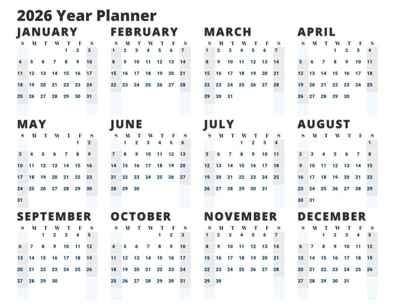 The image represents a practical approach to yearly planning. It allows users to visualize the entire year at a glance, making tracking important dates, events, and deadlines easier. Whether for personal use, business planning, or educational purposes, this printable year planner streamlines organization and ensures efficient time management.