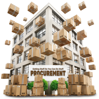 This image showcases a modern procurement office building with multiple floors and windows. In front of the building, there is a sign that reads “Getting Stuff So You Can Do Stuff PROCUREMENT”. Surrounding the building are numerous cardboard boxes mid-air, giving an impression of active shipping or receiving goods. The text on the sign can be changed with our customization application.