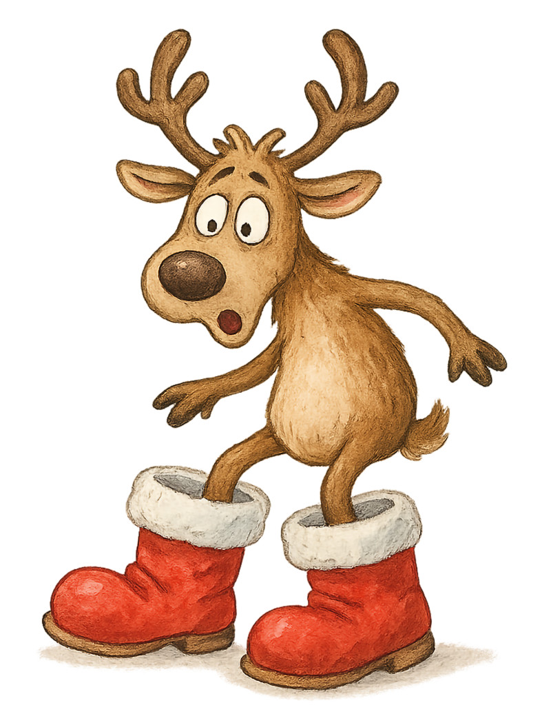This whimsical clipart features a clumsy reindeer hilariously attempting to wear oversized Santa's boots. The reindeer, with its surprised expression and playful stance, captures the essence of holiday fun and mischief. The bright red boots with fluffy white trim contrast beautifully with the reindeer's light brown fur, creating a delightful visual that embodies the spirit of Christmas. This charming illustration is perfect for adding a touch of humor to any festive presentation.