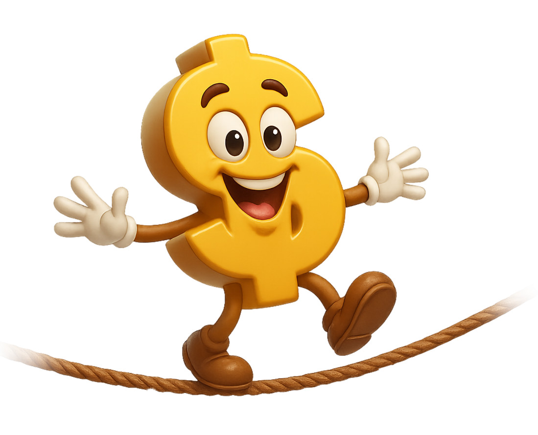 This vibrant image features a cartoonish dollar sign character joyfully balancing on a rope, symbolizing the precarious nature of financial decisions. The character's cheerful expression contrasts with the serious implications of balancing budgets and navigating tax rates. The visual elements convey a sense of playfulness while addressing the complex topic of money management, making it relatable and engaging for various audiences.