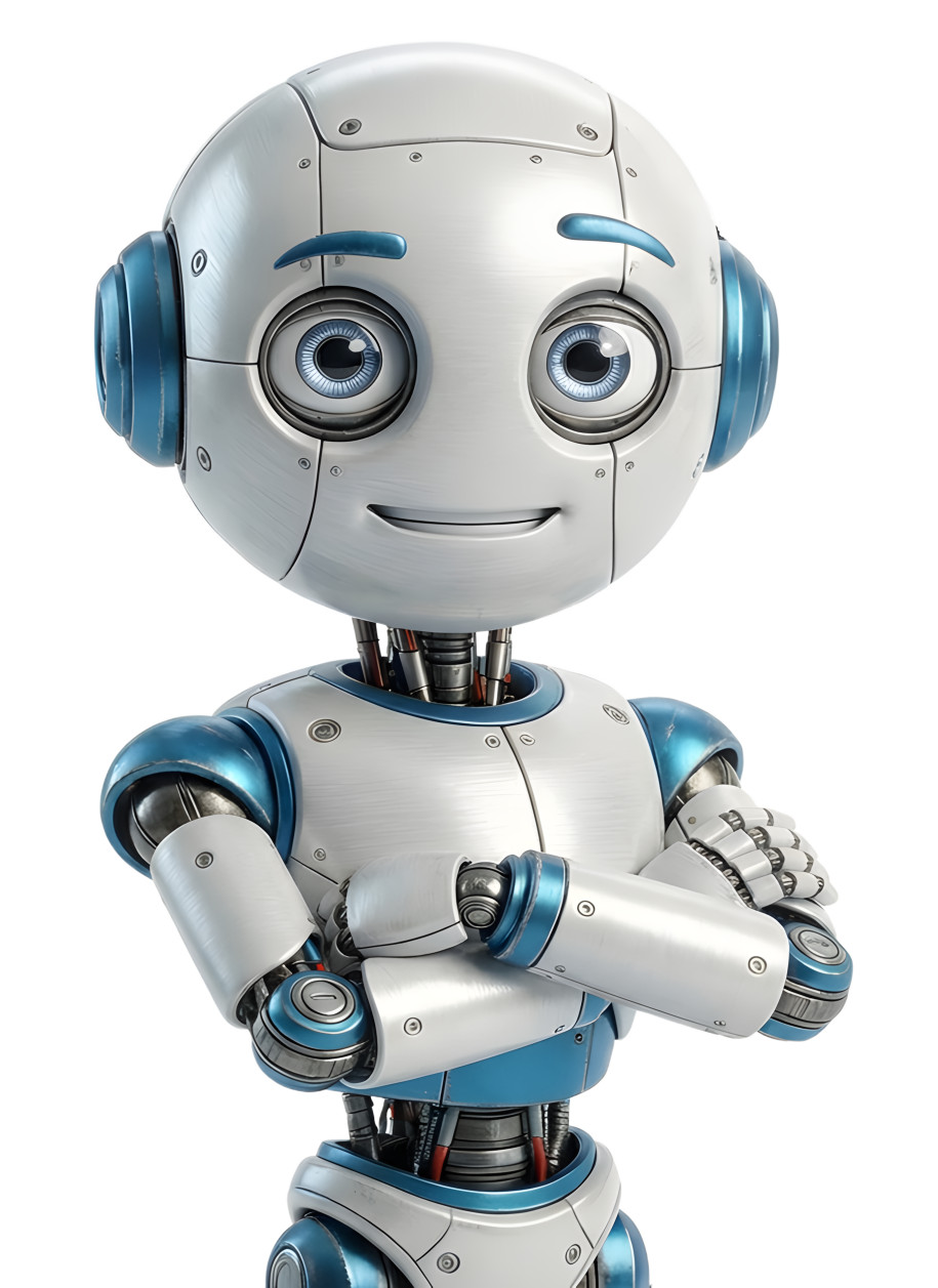 This clipart features a confident robot standing with its arms crossed, showcasing a friendly and approachable demeanor. The robot is designed with a shiny metallic finish and blue accents, which enhance its modern and futuristic look. Its large, expressive eyes and gentle smile add a touch of personality, making it an ideal representation of innovation and technology. This character embodies confidence and reliability, making it suitable for various presentations related to robotics, technology, and automation.