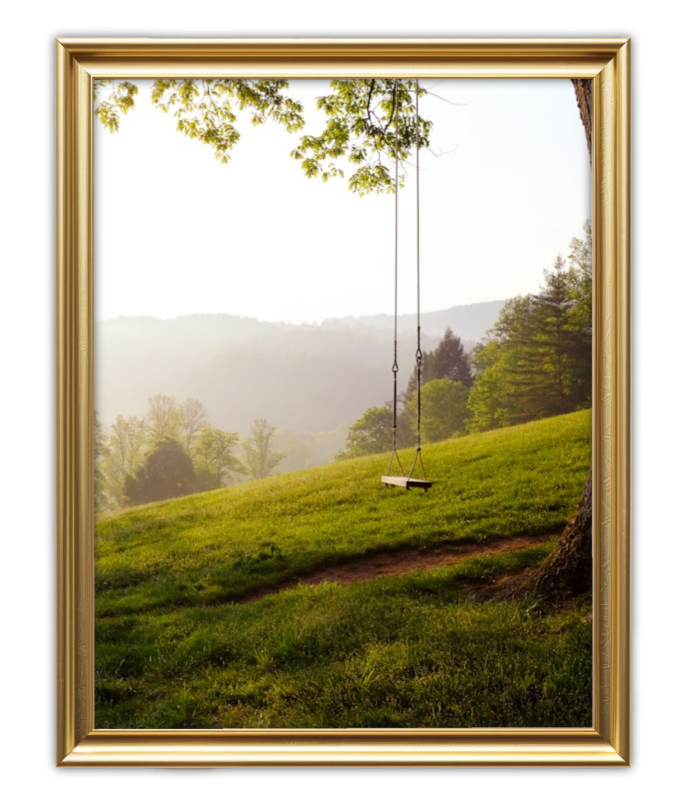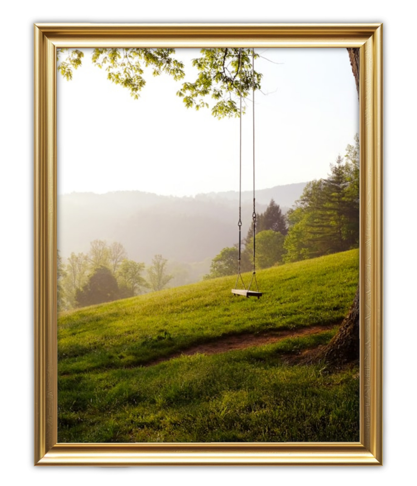 This image displays a single, ornate gold photo frame with a placeholder image of a serene landscape featuring a swing hanging from a tree branch, overlooking rolling hills bathed in soft sunlight. The frame's design is classic and elegant, with intricate detailing along the borders that adds to its luxurious appearance.