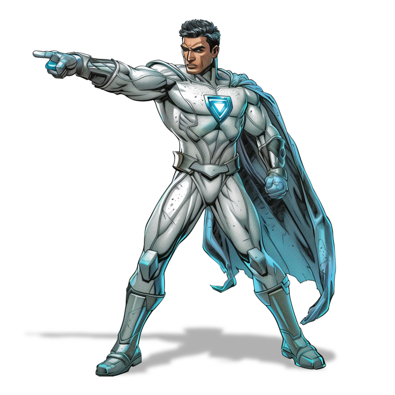 This image captures a superhero with a muscular build, wearing a tight-fitting suit with blue accents and a cape, pointing decisively to the left. This commanding pose can convey authority, direction, and action—ideal for engaging an audience during a presentation.