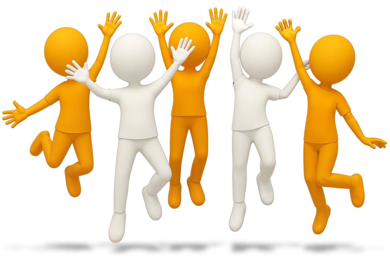 This vibrant clipart image showcases a lively scene of a team celebration, featuring five animated characters joyfully jumping and raising their hands in excitement. The characters are depicted in a mix of bright colors, including orange and white, which enhances the festive atmosphere. This presentation clipart captures the essence of happiness and teamwork, making it ideal for presentations that emphasize collaboration, success, and celebration. The dynamic poses of the characters convey a sense of energy and enthusiasm, perfect for illustrating themes of achievement and camaraderie.