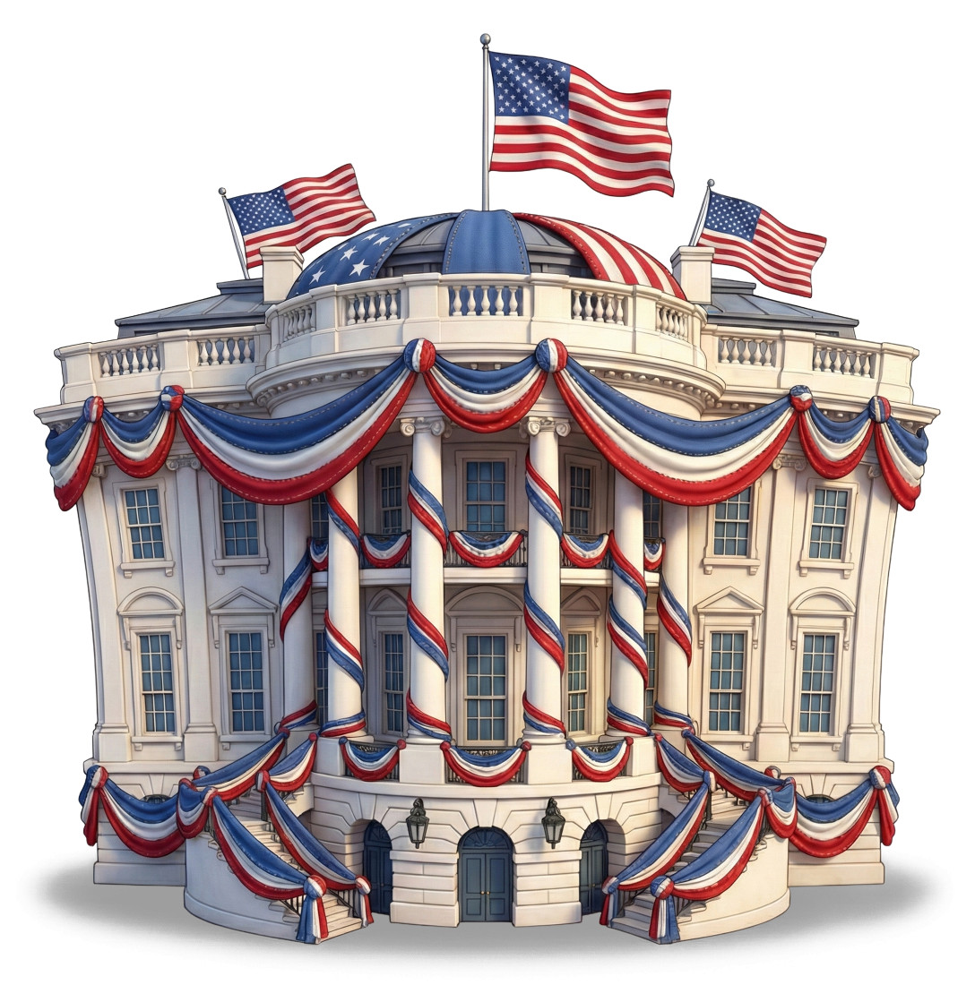 This vibrant image showcases the White House decorated with festive elements, embodying the spirit of American celebrations. The iconic building is adorned with red, white, and blue bunting, complemented by waving American flags atop its roof. This visual representation captures the essence of national pride and festive occasions such as Presidents Day and Independence Day, making it a perfect illustration for themes related to patriotism and celebration.