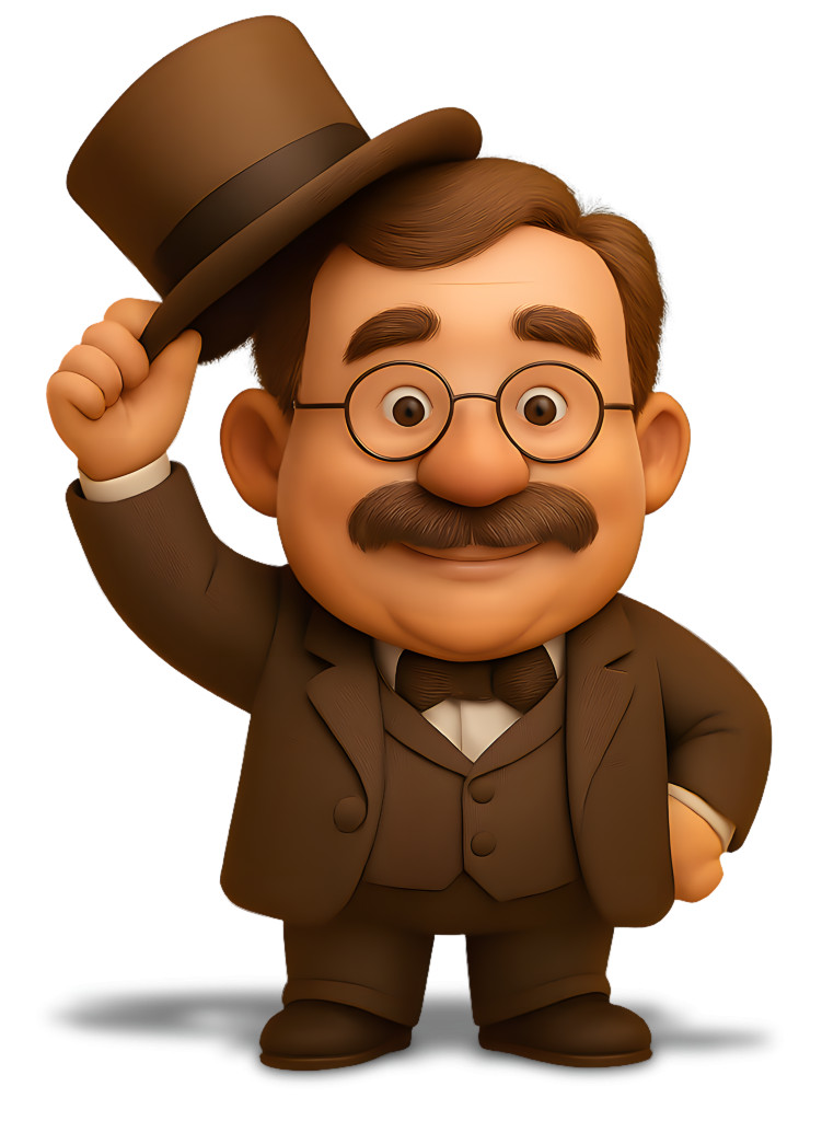 This charming clipart features a cartoonish representation of Theodore Roosevelt, the 26th President of the United States, joyfully raising his top hat. The character is depicted with a friendly smile, round glasses, and a classic suit, embodying the spirit of the early 20th century. This illustration captures Roosevelt's charismatic personality and his iconic status in American history, making it perfect for educational presentations or themed events.