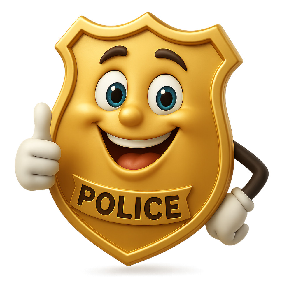 This vibrant clipart features a cheerful police badge character giving a thumbs up, symbolizing positivity and approval. The badge is designed with a friendly face, bright colors, and a shiny golden appearance, making it an engaging visual for presentations. This police badge represents safety, trust, and community support, ideal for educational or community-focused themes.