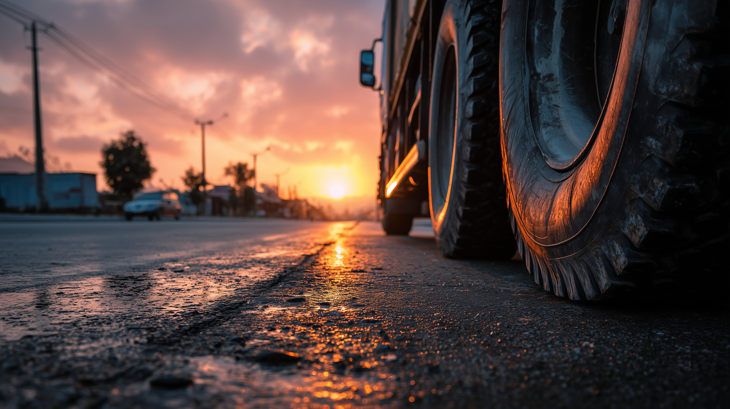 This captivating PNG image with a transparent background showcases a truck tire resting on a wet road, illuminated by the warm hues of a stunning sunset. The reflective surface and glowing sky evoke a powerful sense of transportation, logistics, and the steady movement of goods across long distances. It perfectly symbolizes the hard work, reliability, and dedication behind every journey on the open road. The combination of metal, motion, and natural light creates a professional, visually appealing element for presentations focused on delivery, supply chains, or the trucking industry.