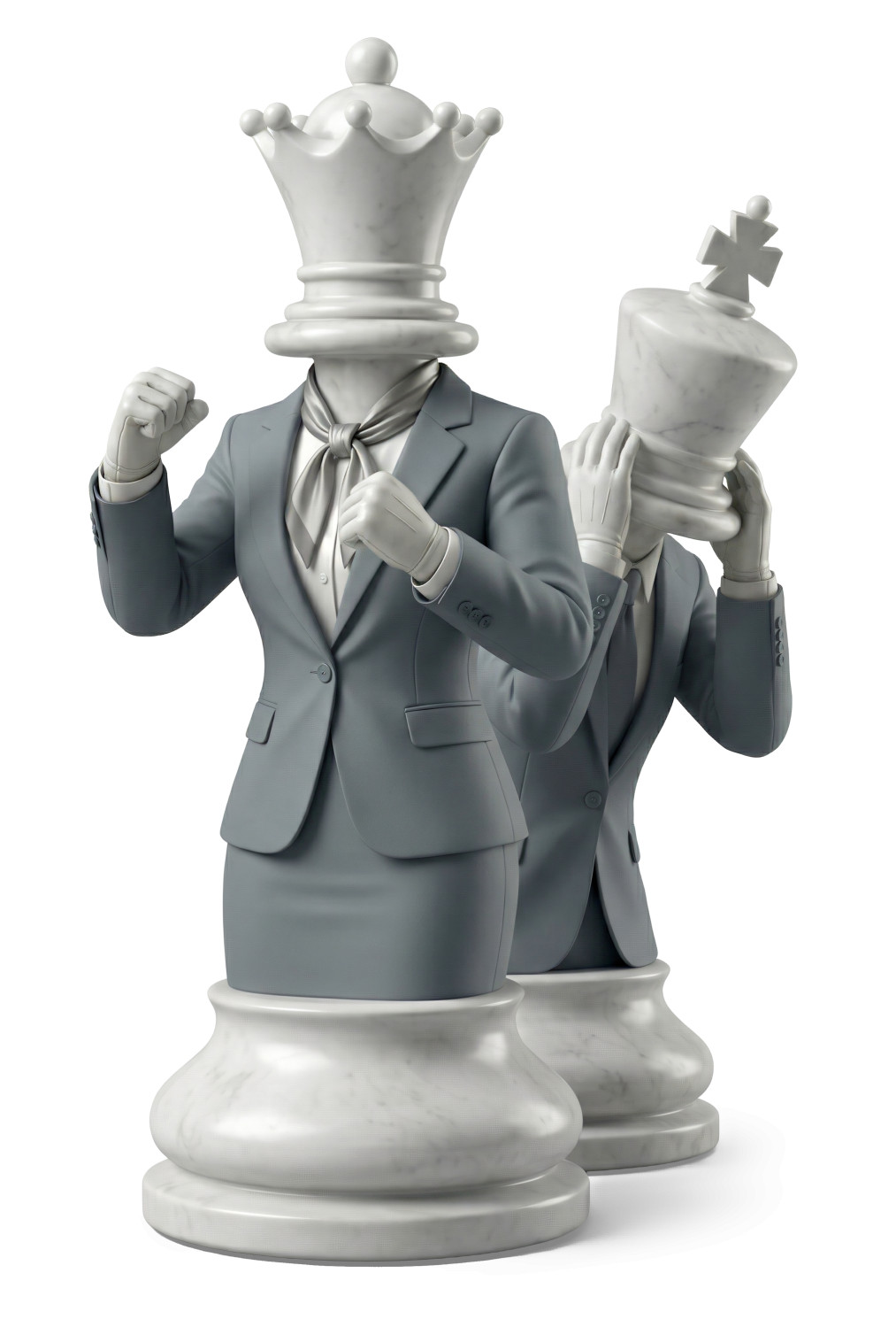 This striking image creatively blends the concepts of business strategy and protection, showcasing two chess pieces designed as business figures. The prominent white queen, symbolizing power and strategy, is depicted in a suit, emphasizing the importance of preparedness in the corporate world. The figures stand on a marble base, representing stability and strength in decision-making. This visual metaphor effectively communicates the idea of strategic planning and the protective measures necessary for success in business.