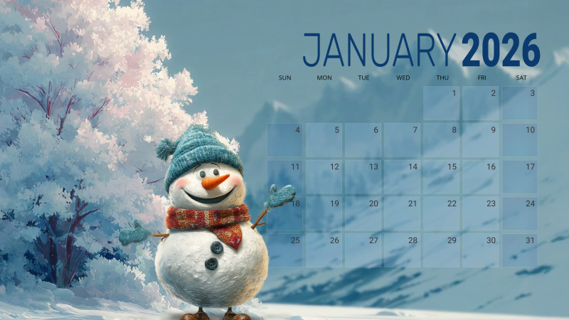This delightful winter calendar template showcases a cheerful snowman amidst a serene snowy landscape. The snowman, adorned with a cozy scarf and a knitted hat, stands against a backdrop of frosty trees and majestic mountains, embodying the essence of winter. This visually appealing design is perfect for adding a touch of whimsy and warmth to your monthly planning, making it ideal for both personal and professional use.