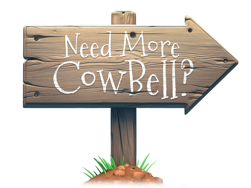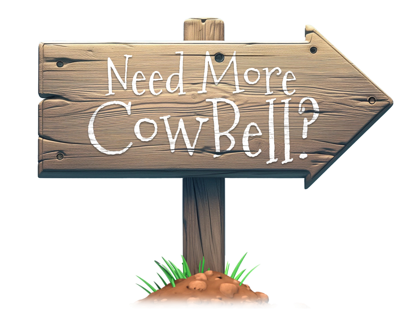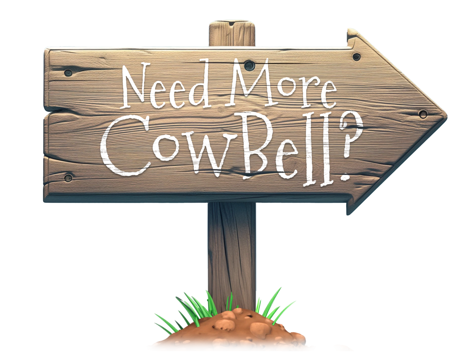 This image features a wooden arrow sign with the placeholder text "Need More CowBell?" written on it. The sign is made of planks of wood and pointing to the right. It's mounted on a wooden post that's firmly planted in a small mound of dirt, surrounded by tufts of grass. The text is customizable and can be easily edited or removed to fit various contexts.
