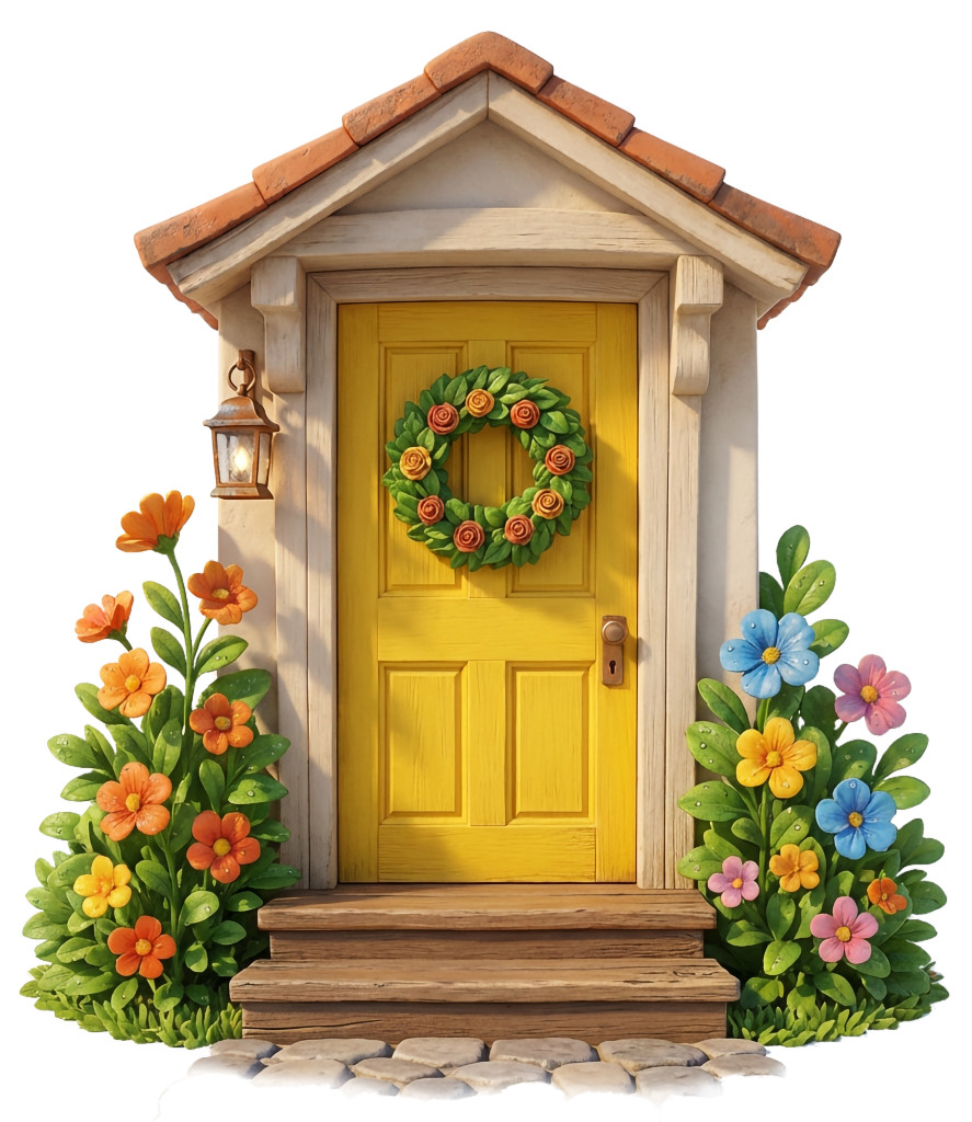 This charming clipart features a sunny yellow door adorned with a welcoming wreath, surrounded by a vibrant flower garden. The door’s bright hue invites warmth and friendliness, while the lush greenery and colorful blooms enhance the inviting atmosphere. This image captures the essence of a cozy home entrance, making it perfect for presentations that emphasize hospitality, home decor, or seasonal themes.