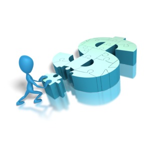 A stick figure attempts to place the last piece in the dollar sign puzzle in this finance animated clipart.